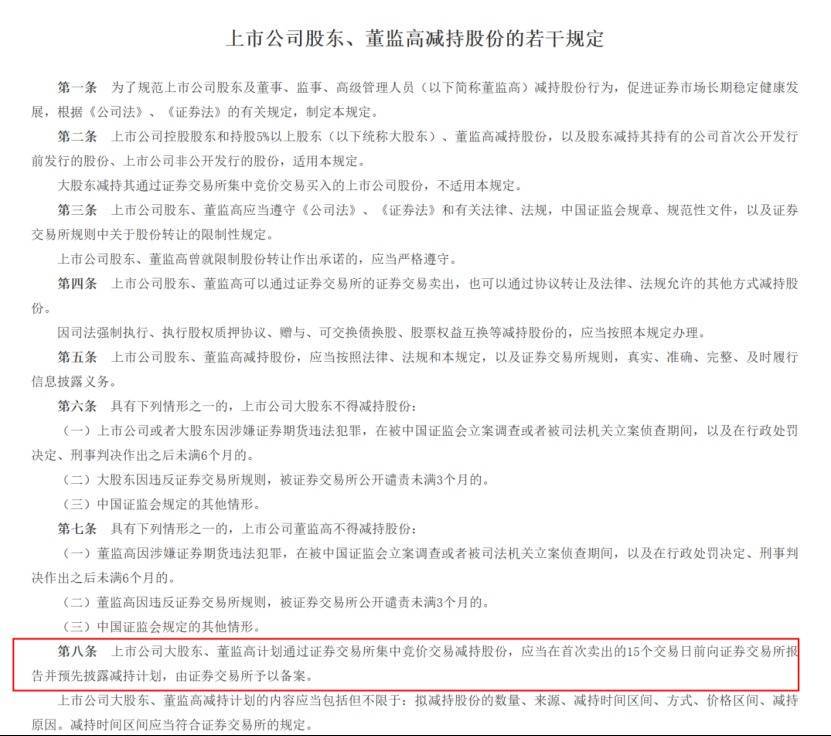 同时,根据《上市公司股东、董监高减持股份的若干规定》,上市公司大股东、董监高计划通过证券交易所集中竞价交易减持股份,应当在首次卖出的15个交易日前向证券交易所报告并预先披露减持计划,由证券交易所予以备案。
