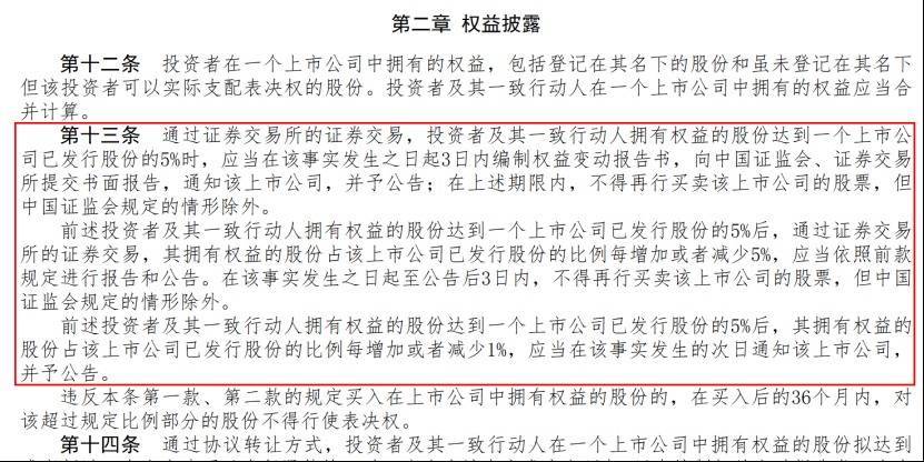 记者查阅相关资料发现,从监管规则来看,根据《上市公司收购管理办法》第十三条规定,通过证券交易所的证券交易,投资者及其一致行动人拥有权益的股份达到一个上市公司已发行股份的5%时,应当在该事实发生之日起3日内编制权益变动报告书,向中国证监会、证券交易所提交书面报告,通知该上市公司,并予公告。