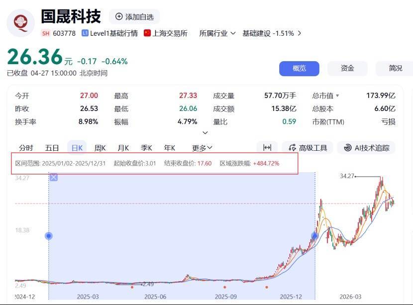 国晟科技报收26.36元/股,较前一交易日微跌0.64%。拉长时间线看,国晟科技股价2025年全年从最初的3.01元/股,涨至年末的17.60元/股,区间涨幅484.72%;自2026年年初至今,国晟科技的股价区间涨幅为36.16%。