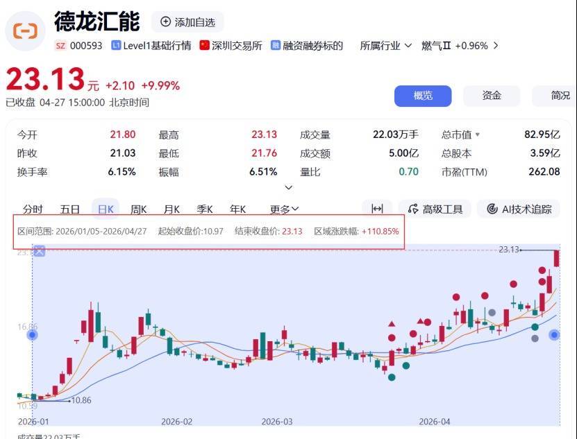 德龙汇能涨停报收23.13元/股,较前一交易日上涨9.99%;自2026年年初至今,股价从起始的10.97元/股,涨至如今的23.13元/股,区间涨幅达110.85%。
