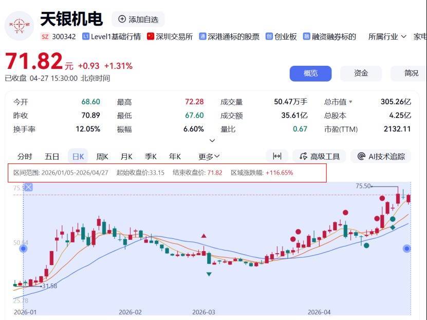 天银机电报收71.82元/股,较前一交易日上涨1.31%。4月以来公司股价持续走高,4月1日至4月27日区间累计涨幅超35.03%。自2026年年初至今,天银机电股价区间涨幅达116.65%。