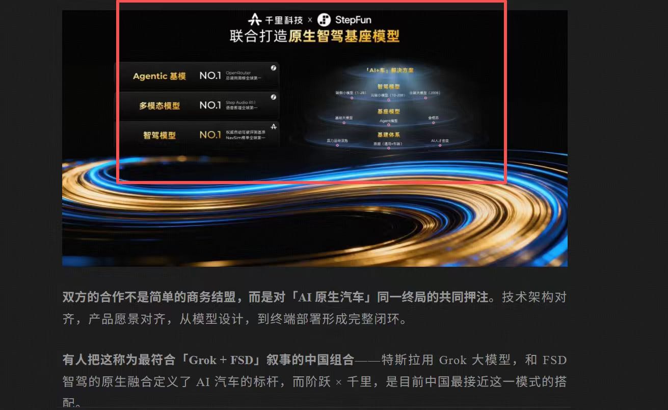 有人把这称为最符合「Grok + FSD」叙事的中国组合——特斯拉用 Grok 大模型,和 FSD 智驾的原生融合定义了 AI 汽车的标杆,而阶跃 × 千里,是目前中国最接近这一模式的搭配。